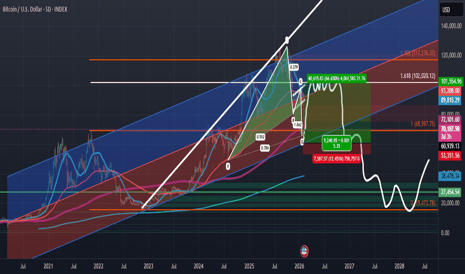 This analysis outlines a technical view of Bitcoin’s current structure based on historical price behavior and Fibonacci extensions. It is not a forecast and should not be interpreted as financial advice.