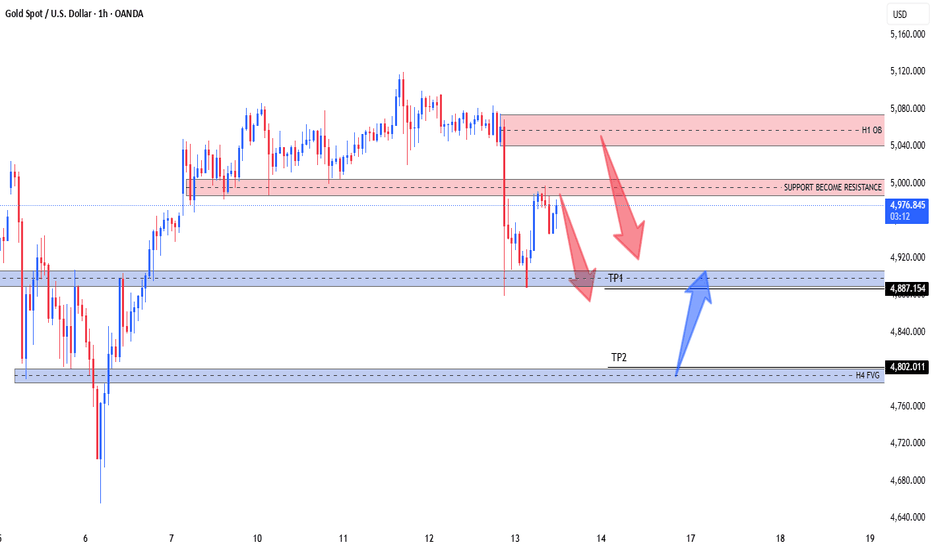 XAUUSD | H1 Market OutlookPrice is consolidating below a key horizontal resistance (~5093) after a strong displacement move from the higher timeframe Bearish Order Block.