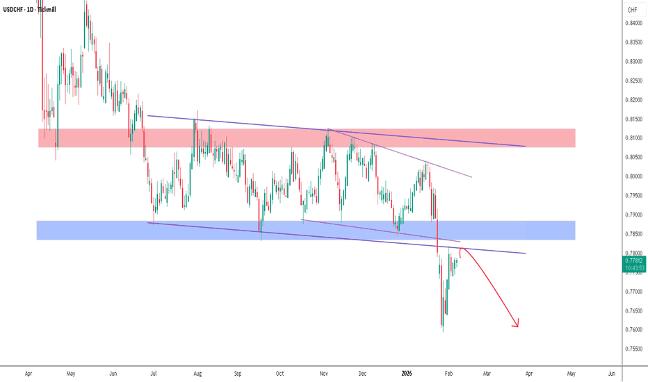 This chart shows a bearish technical analysis for the USD/CHF (US Dollar vs. Swiss Franc) currency pair on a daily timeframe.