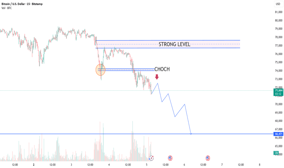 Bitcoin is currently displaying bearish price behavior, with price respecting the 75,000 resistance zone and failing to establish acceptance above this level. Recent price action suggests selling pressure remains present near higher levels.