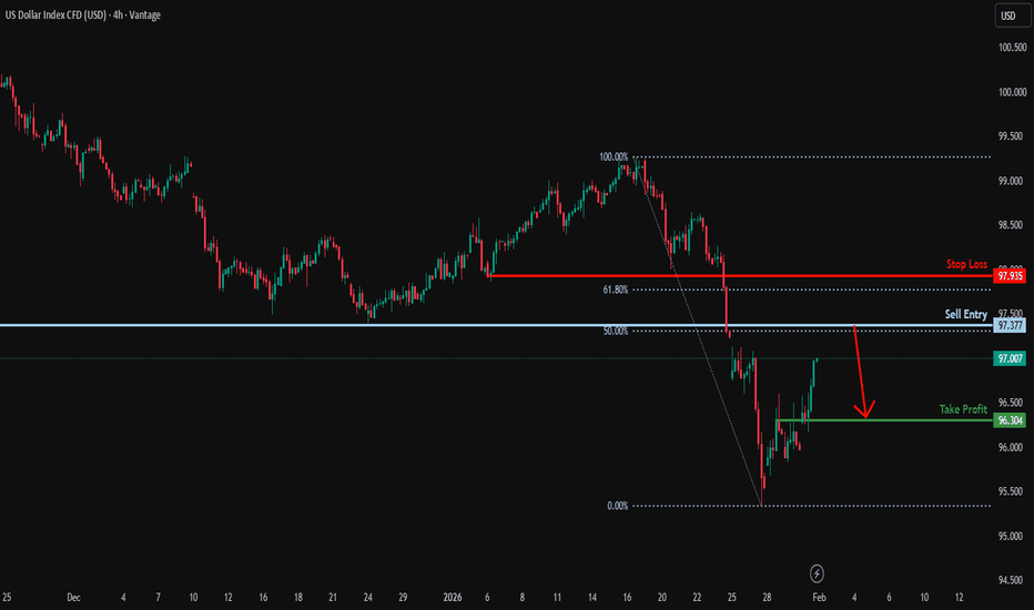 Heading towards key resistance?US Dollar Index (USD) is rising towards the resistance level, which is an overlap resistance that aligns with the 50% Fibonacci retracement and could reverse from this level to our take profit.