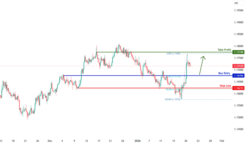 EURUSD H4 | Fallling Towards 50% Fib SupportThe price is falling towards our buy entry level at 1.1676, which is an overlap support that aligns with the 50% Fibonacci retracement.