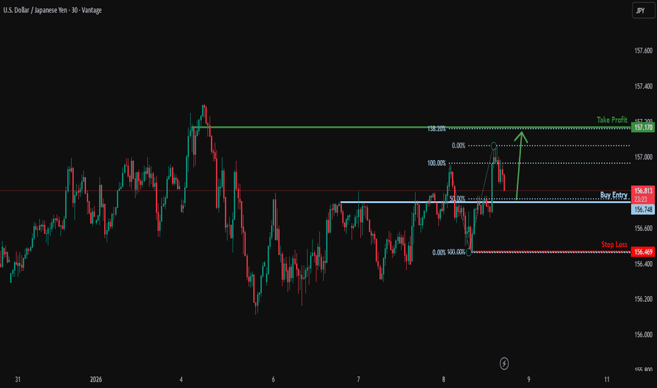 Could we see a bounce from here?USD/JPY is falling towards the support level, which is a pullback support that aligns with the 50% Fibonacci retracement and could bounce from this level to our take profit.