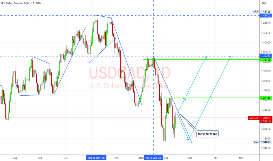USDCAD After Selloff Structure Building for a Recovery LegUSDCAD has shifted from a clean downtrend into a compression phase, and that usually means one thing on the higher timeframe a directional break is getting closer. The daily structure shows a sharp selloff, a strong reaction from the lows, and now a tightening wedge under resistance. With oil, rate expectations, and USD flows all pulling on this pair, this is one of those spots where structure and macro are about to collide. I’m treating this as a decision zone, not a drift zone.