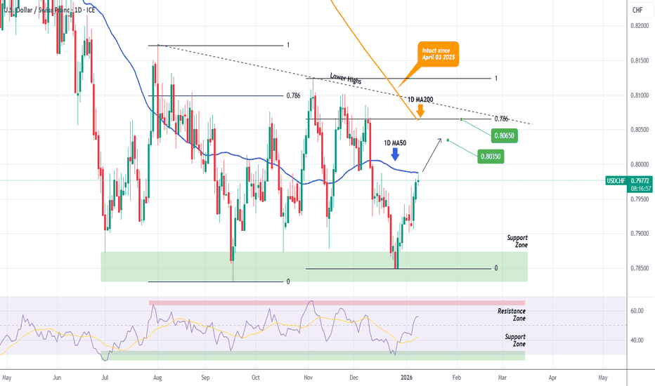 USDCHF Moment of truth on the 1D MA200 is coming.The USDCHF pair is on a strong rise since its December 26 2025 Low, which is technically the Bullish Leg of the long-term Descending Triangle. Today it is testing the 1D MA50 (blue trend-line) and if broken, will be the perfect buy continuation signal.