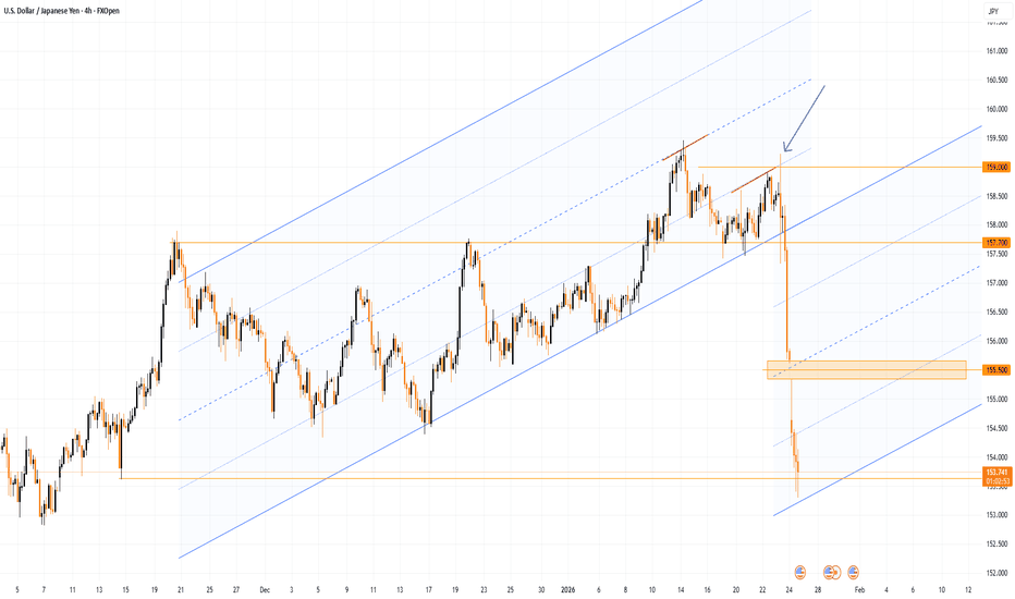 Notably, after that analysis, another bearish signal emerged on the USD/JPY chart — a bull trap (marked by the arrow) above the 159 level — followed by a break below the channel’s lower boundary.