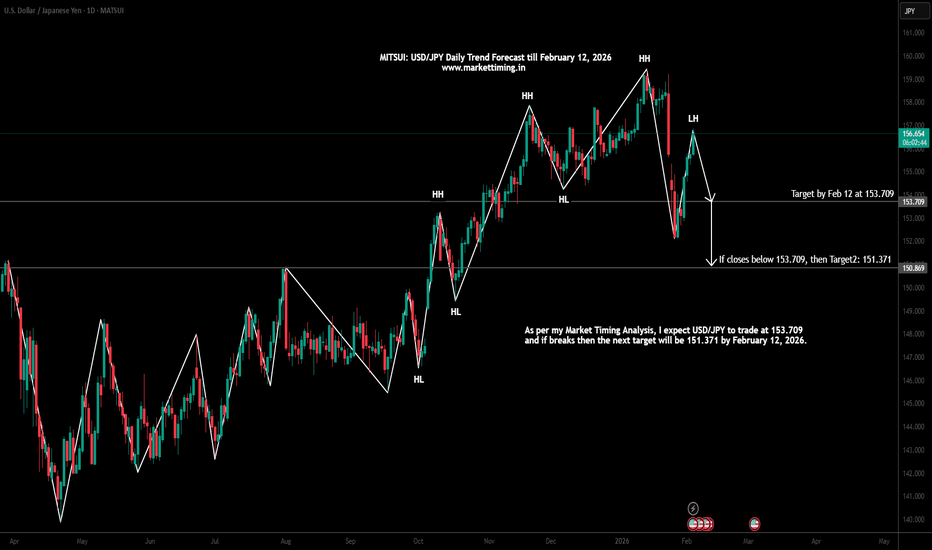 USD/JPY target by February 12, 2026As per my Market Timing Analysis, I expect USD/JPY to trade at 153.709 and if breaks then the next target will be 151.371 by February 12, 2026.