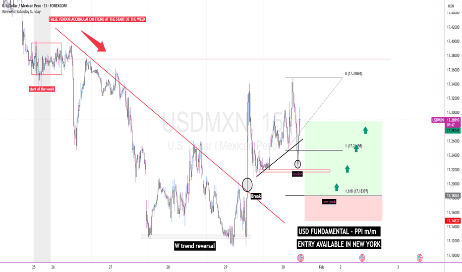 USD/MXN trend breakout monitoringWe see that the price created a false bearish accumulation trend at the start of the week to generate the midweek reversal in the corresponding liquidity zone, which produced a trend breakout telling me that the price will change direction. Therefore, along with the daily setup, it's telling me that if New York sweeps the London low, improving prices to buy with a stop hunt, we can go with an institutional buy. However, the entry can only be taken in New York; if it doesn't occur at the corresponding time, the opportunity will not be pursued.