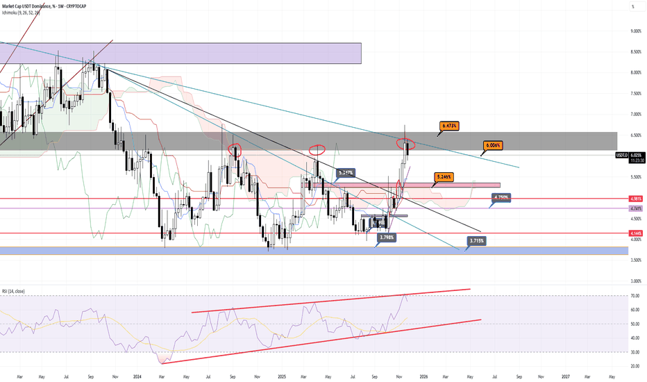 USDT dominance (USDT.D) USDT dominance (USDT.D) remains elevated and is in a major uptrend, indicating that a significant portion of crypto capital is still parked in stablecoins and in a risk-off position.