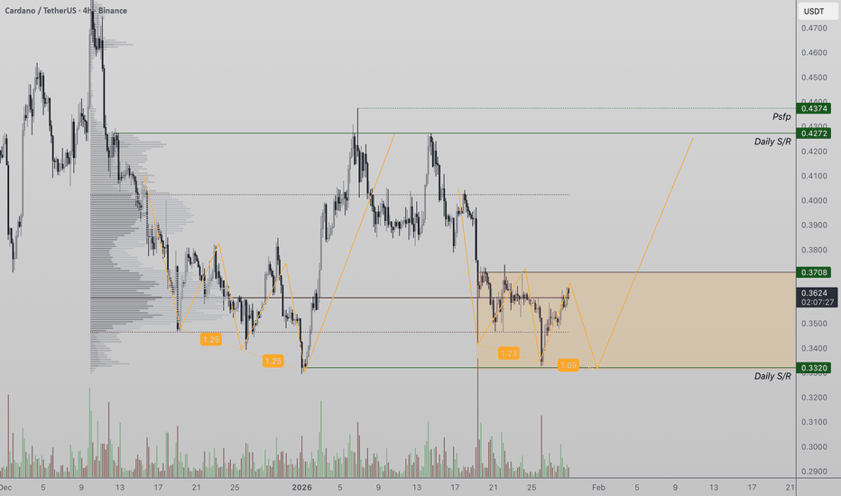 After rejecting from $0.42, ADA has corrected in a controlled manner and is now consolidating around the point of control (POC) within the broader range. This area often acts as a decision point. A short-term rejection here would still align with the historical fractal, as the previous pattern also included consolidation before a successful retest of support.