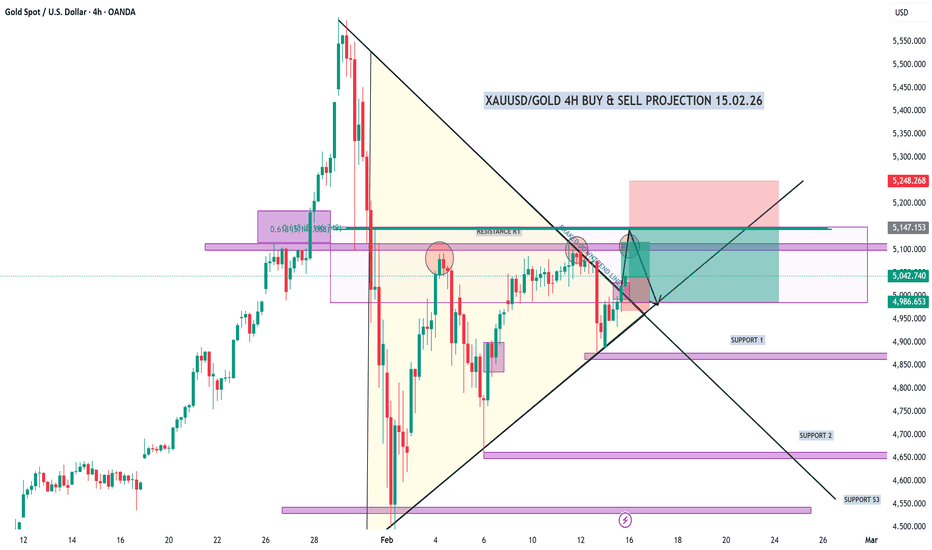 XAUUSD/GOLD 4H BUY & SELL PROJECTION 15.02.26Let’s take a look at Gold on the 4-hour timeframe and break down the possible buy and sell scenarios.