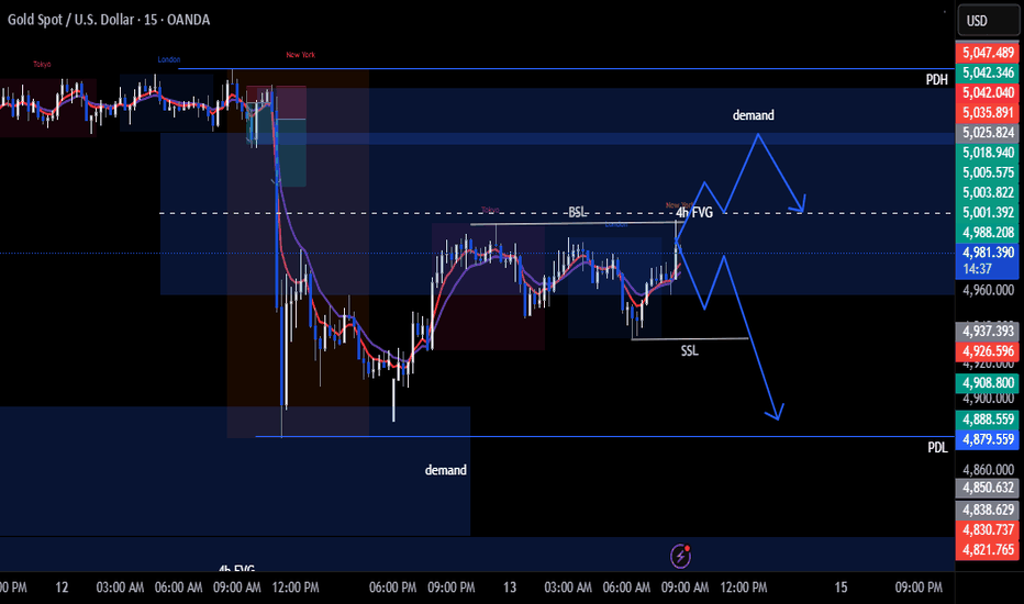 Price was ranging under a clear resistance zone (≈ 4,992 – 5,018) before printing a strong bearish impulse candle that decisively broke structure to the downside. This move invalidated short-term bullish momentum and shifted bias intraday to bearish.
