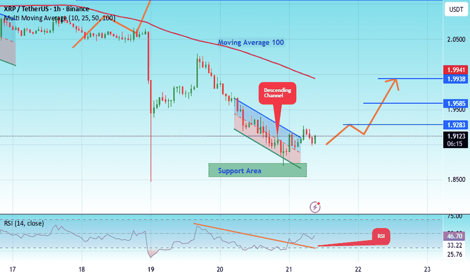 The price is moving in a descending channel on the 1-hour timeframe. It has reached the lower boundary and is heading towards breaking above it, with a retest of the upper boundary expected.