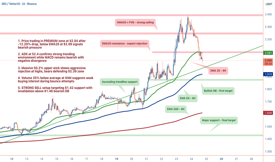 ZROUSDT: Premium Zone RejectionZRO delivered a textbook premium zone rejection with a -12.20% drop to $2.04. That 50.2% upper wick tells the story, bulls attempted a push, got obliterated, and now we're trading below EMA20 at $2.09. When you're in premium territory and getting rejected this violently, the probability matrix tilts bearish.