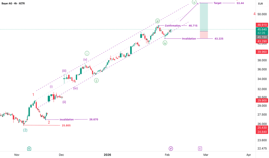 Looks like Bayer is moving higher with wave 5 green, target 53.