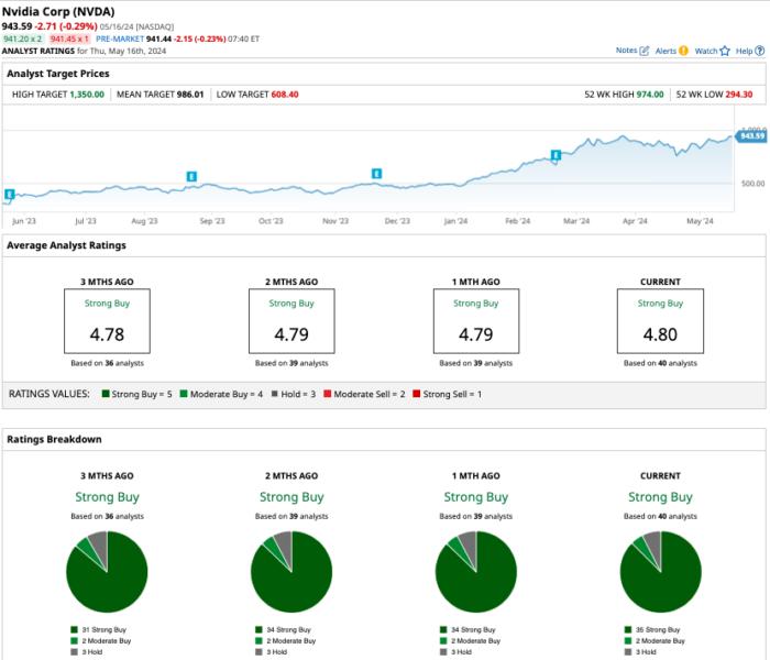 Out of the 40 analysts covering NVDA stock, 35 recommend “strong buy,” two recommend “moderate buy,” and three recommend “hold.”