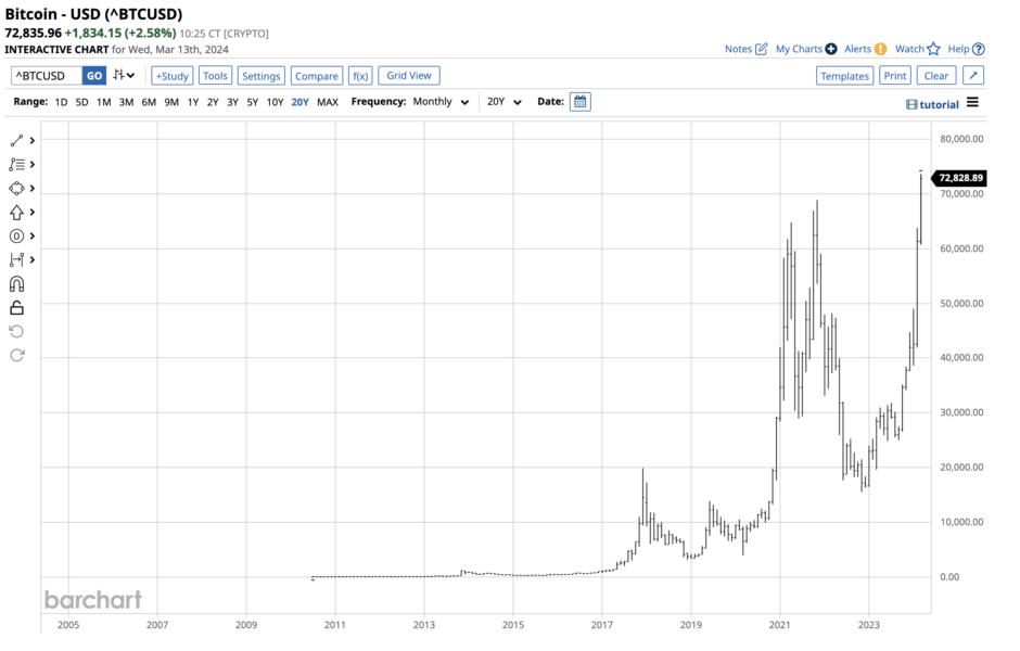 At over the $72,800 per token level, Bitcoin’s market cap was over $1.428 trillion, with a $2.73 trillion value of the total asset class. Bitcoin rallied 375% from the November 2022 low at the most recent high.
