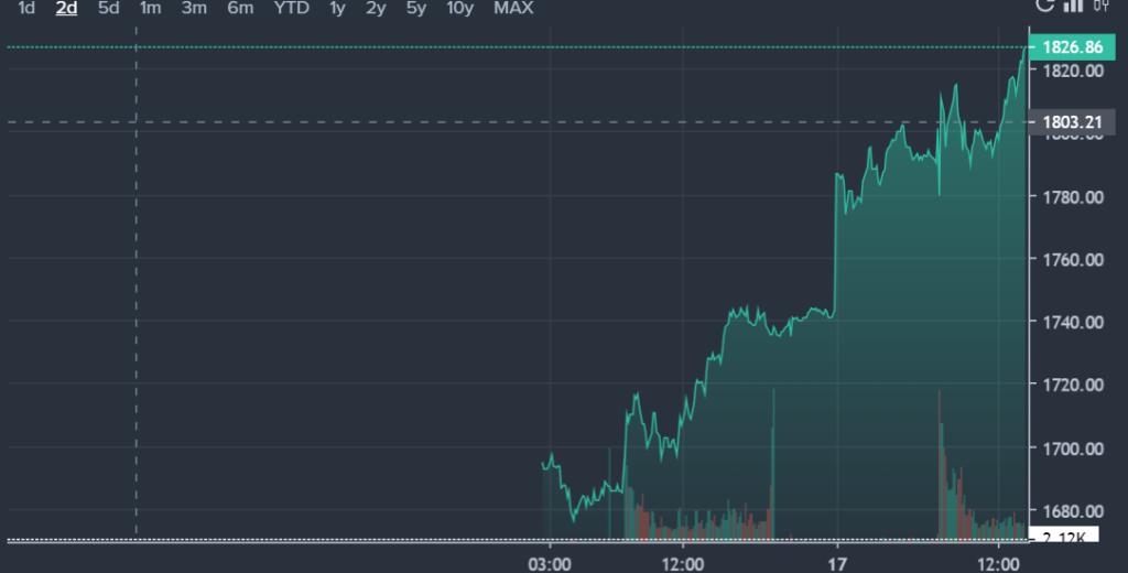 AVGO Price Action: Broadcom shares were up 5.20% at $1825.19 at the time of writing, according to Benzinga Pro.