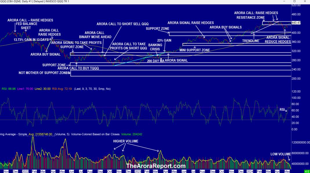 - The chart shows Arora calls to raise hedges near the top and the Arora call to reduce hedges near the bottom. When hedges are used over a long period of time, they can add significant amounts to your returns and significantly lower your risks. If you do not hedge, you can simply adjust cash. Please see the “Protection Band And What To Do Now” section below.