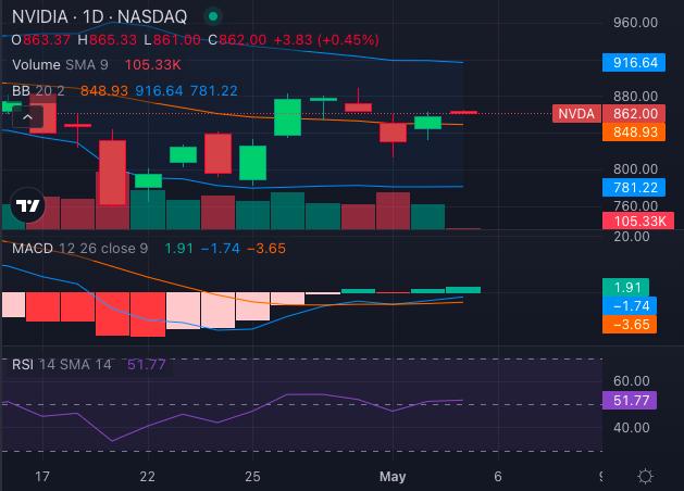 - The oscillators are signalling bullishness. Nvidia stock’s price has moved to upper (bullish) Bollinger Band from the lower (bearish) one.