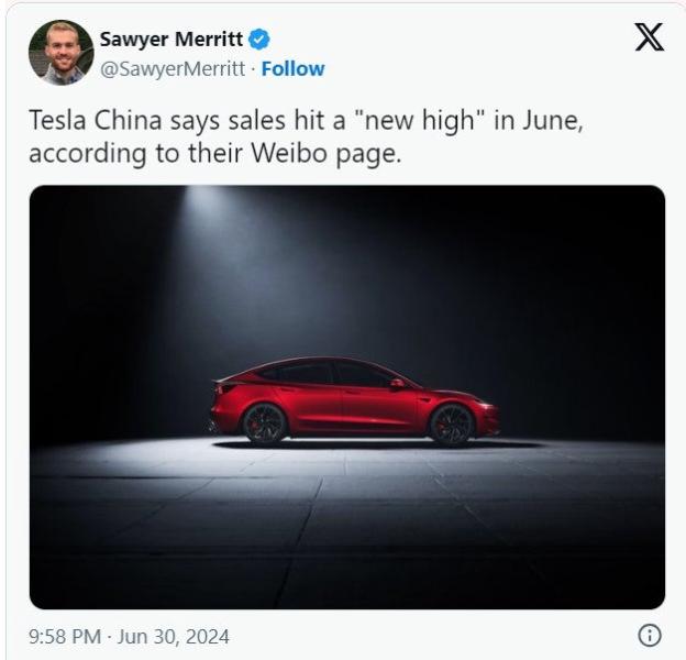 We wondered to what extent Monday's move in Tesla shares was due to posts like this one saying that Tesla sales in China hit a record in June.