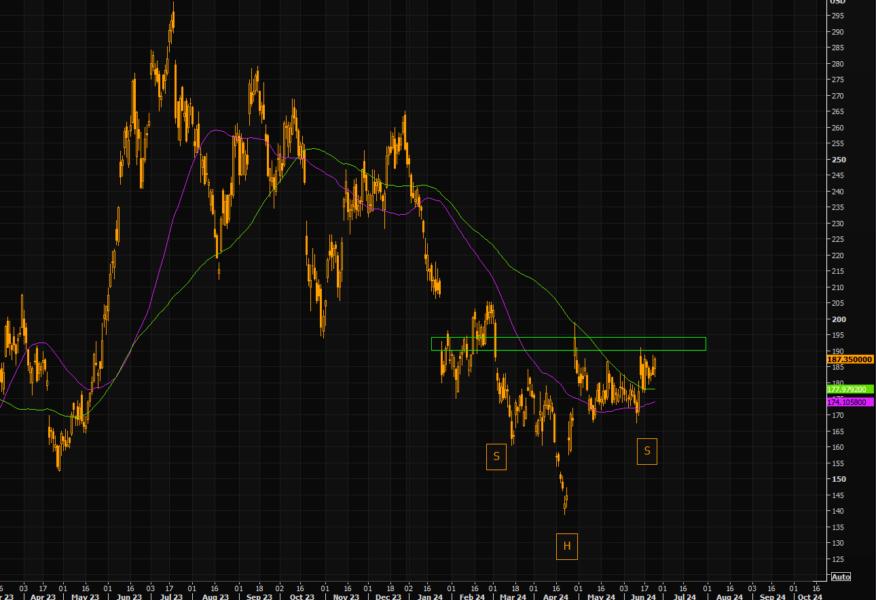 The short term chart is showing some sort of inverse head and shoulder formation having formed over the past few months. $190/195 is resistance area. A close above it and things could get short term "dynamic". Note the 50 day has flipped to sloping positive and could be crossing above the 100 day soon.