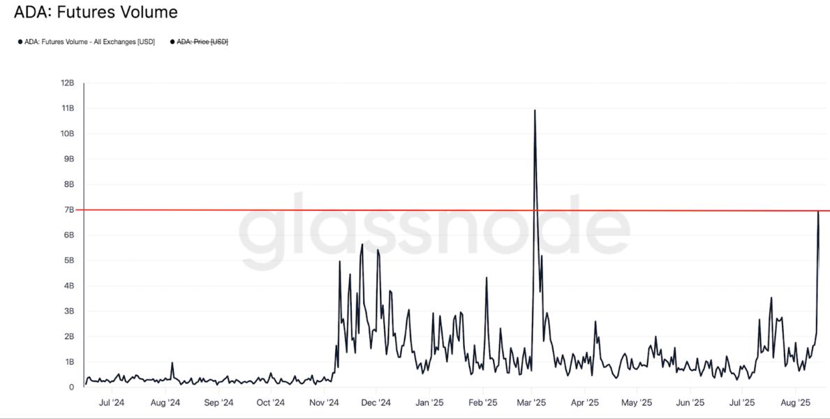 The futures volume has reached March 2025 levels, the last time the ADA prices were above $1.