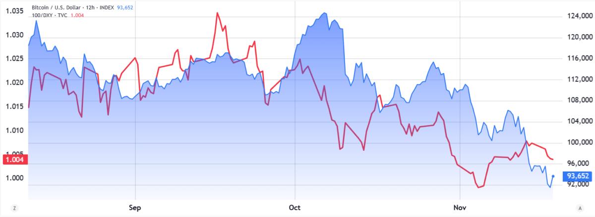 Still, blaming Bitcoin’s weakness only on the Fed seems inaccurate, given that the downtrend started in early October. US import tariffs helped narrow the monthly government deficit, and the Fed’s balance sheet continued to shrink, causing the US dollar to strengthen against a basket of major currencies. Historically, Bitcoin holds an inverse correlation to the dollar Index (DXY).