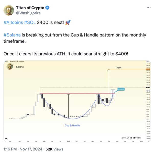 Pseudonymous analyst Titan of Crypto says SOL could possibly hit the $400 mark as it appears ready to break out of a cup-and-handle pattern.