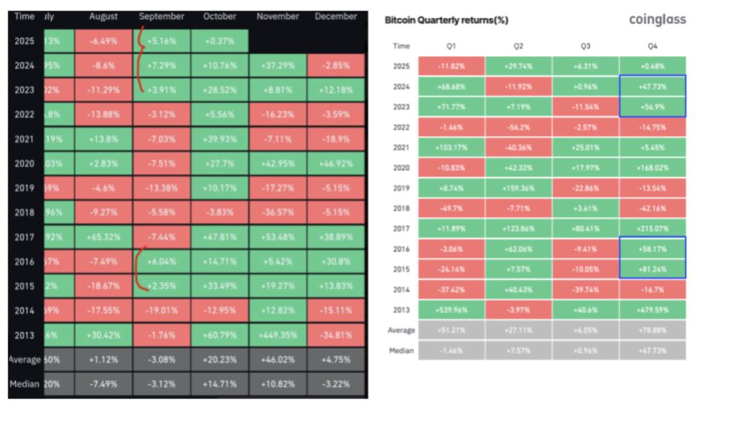 Bitcoin's green September close historically precedes Q4 rallies, averaging 78% gains.