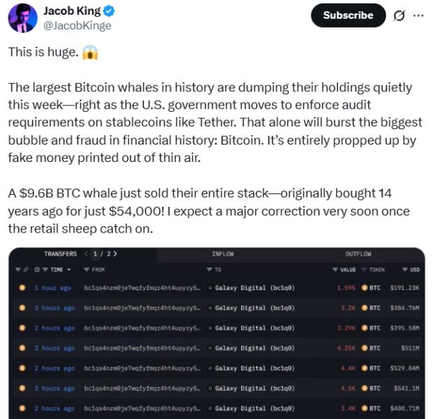 Bitcoin whale’s $9.6B transfer, GENIUS Act spark correction concerns