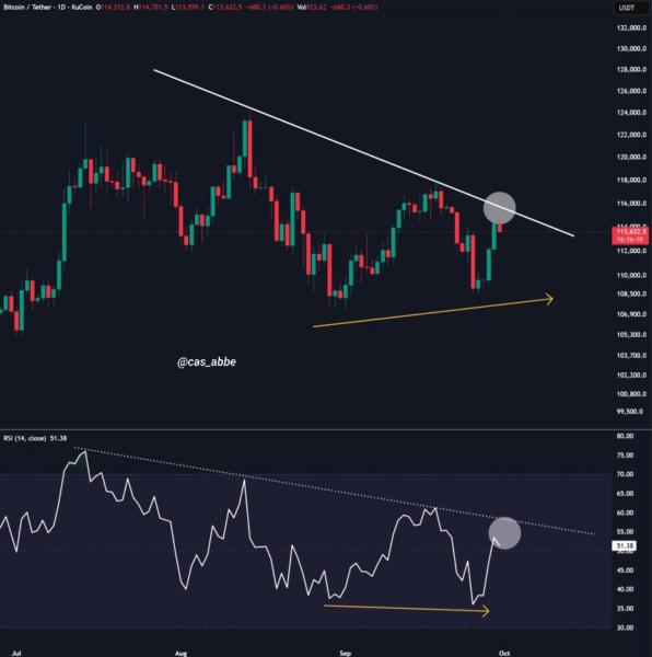 “$BTC is forming a hidden bullish divergence now,” popular trader Cas Abbe told followers in one of his latest posts on X, referring to the relative strength indicator (RSI) on daily timeframes.