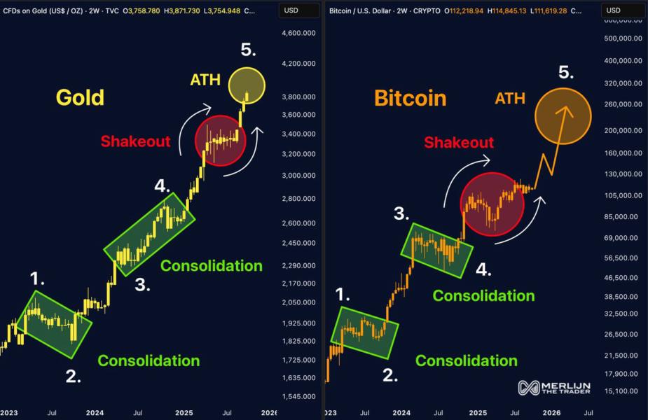 “Gold: shakeout into ATH. Bitcoin: same consolidation, same trap. The breakout is coded. Next stop: price discovery mode,” part of an X post on the day read.
