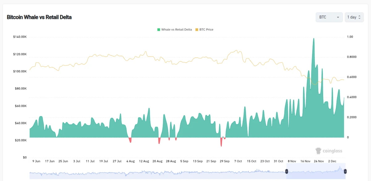 “Whale vs. Retail Delta shows that, for the first time in Bitcoin’s history, whales are this heavily positioned in longs compared to retail traders,” Joao Wedson, founder and CEO of crypto analytics platform Alphractal, told X followers in late November.