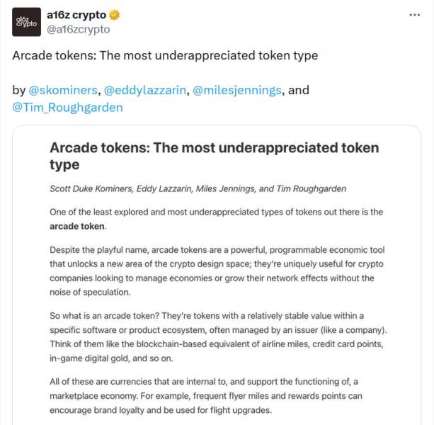 In a report published on Thursday, a16z stated that one of crypto’s most underappreciated token types is called “arcade tokens.”