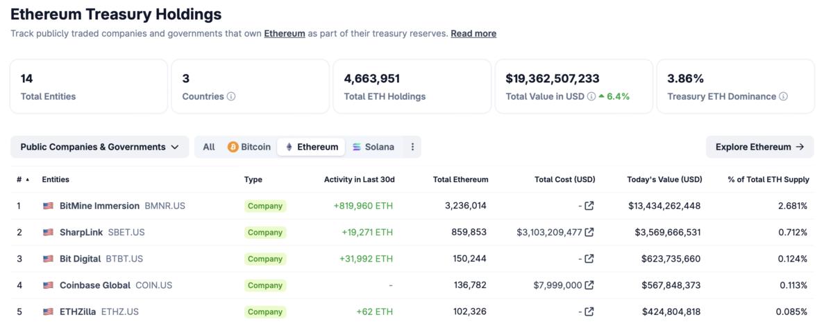 SharpLink is currently the second-largest corporate holder of ETH, with 859,853 ETH worth about $3.57 billion, or 0.71% of total supply, according to CoinGecko data. The planned deployment represents roughly 5.6% of its treasury.