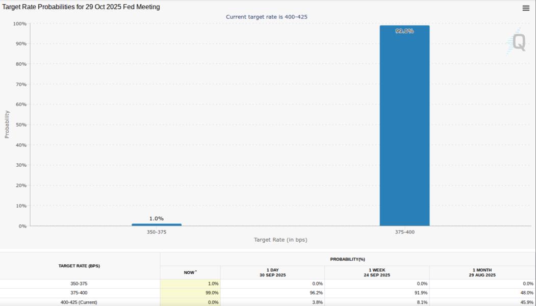 The latest data from CME Group’s FedWatch Tool showed that markets were overwhelmingly betting on the Federal Reserve cutting rates by 0.25% at its October meeting.