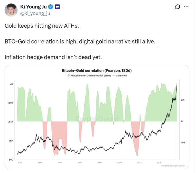 In a Tuesday post on X, Ju noted that the BTC–gold correlation has risen sharply alongside gold’s surge to new all-time highs. “Gold keeps hitting new ATHs. BTC–gold correlation is high; digital gold narrative still alive. Inflation hedge demand isn’t dead yet,” he wrote.