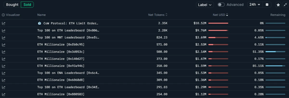 On Monday, a wallet labeled “0x806,” one of the top 100 Ether traders tracked by Nansen, sold over $9.7 million worth of Ether — the second-largest Ether sale during the past 24 hours — data from Nansen showed.