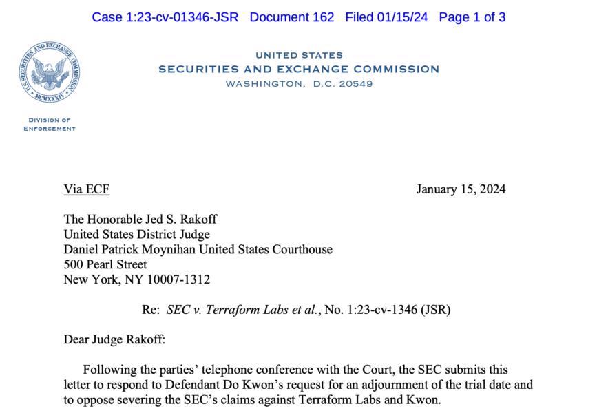 “The SEC joins in Kwon’s request for a modest adjournment so that he may participate in the trial,” said the filing. “If the trial date is adjourned, the SEC respectfully requests that trial commence on April 15, 2024.”