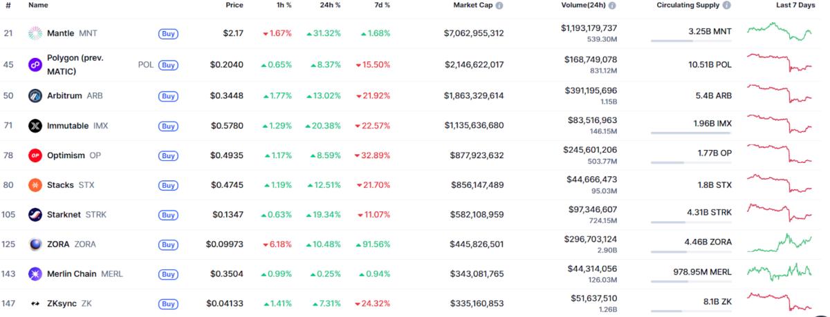 Ethereum layer-2 scaling solution Mantle (MNT) had a 31% rebound on Monday, becoming the third-biggest gainer among the 100 largest cryptocurrencies tracked by CoinMarketCap.