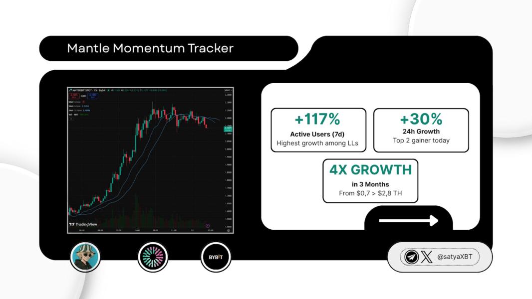 Mantle’s active addresses soared 117% week over week, marking the “strongest growth among all L2s,” according to blockchain sleuth SatyaXBT.