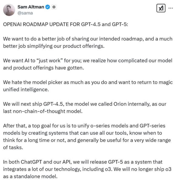 In an updated roadmap posted to X on Feb. 12, Altman said the artificial intelligence firm will first release GPT-4.5, called Orion internally, as OpenAI’s “last non-chain-of-thought model.”