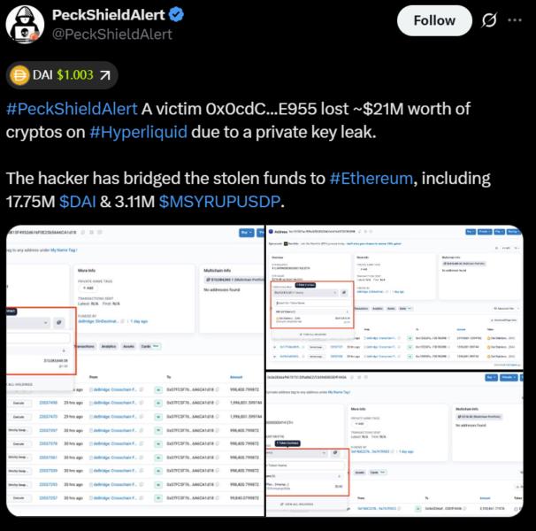 On Thursday, a single user on the decentralized trading platform Hyperliquid lost about $21 million after a private key leak led to an exploit involving the platform’s Hyperdrive lending protocol.