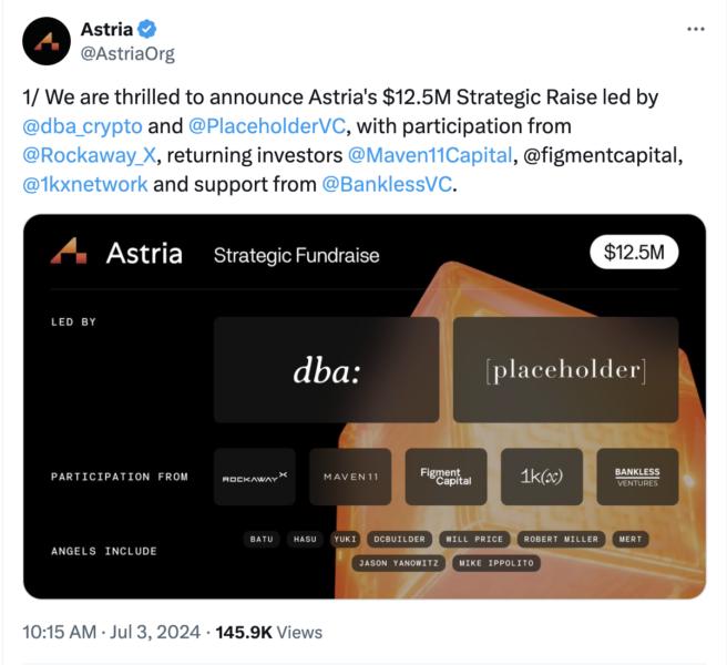 Sequencing layer startup Astria has raised $12.5 million in a strategic funding round led by dba and Placeholder VC, with participation from RockawayX and returning investors. The funds will be used to advance the Astria Sequencing Layer and Astria Stack, enabling permissionless rollup deployment without centralized sequencers, the company said in a statement. The round saw contributions from Maven11, 1kx, Figment Capital, Batu, and angel investors.