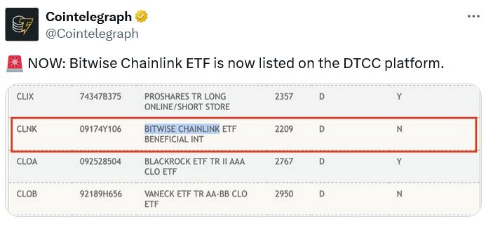Bitwise’s spot Chainlink exchange-traded fund (ETF) has appeared on the Depository Trust and Clearing Corporation’s registry, a usually positive sign that the fund is moving closer to launch.