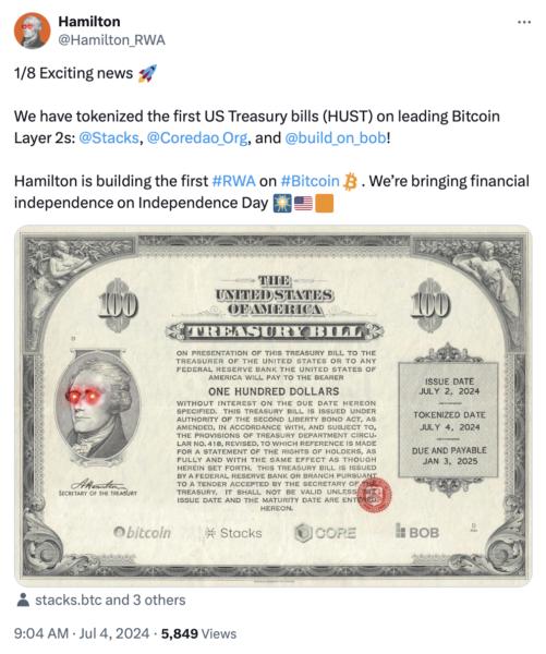Hamilton U.S. T-Bills (HUST) will be available on the Stacks, Core and BoB (Build on Bitcoin) Bitcoin layer-2 solutions. The first transaction with HUST occurred on July 4, according to a statement.