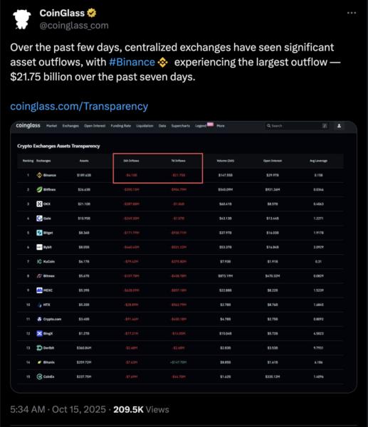 Binance witnessed the highest user withdrawals, $21.75 billion, from a centralized exchange over the past week, including $4.1 billion in outflows within a day, according to data resource CoinGlass.