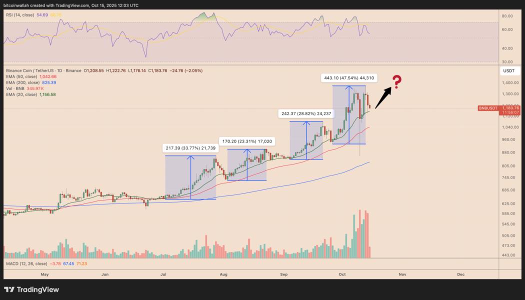 BNB still trades above its key exponential moving average (EMA) supports, including the 20-day EMA (the green wave) near $1,155 and the 50-day EMA (the red wave) at around $1,042.
