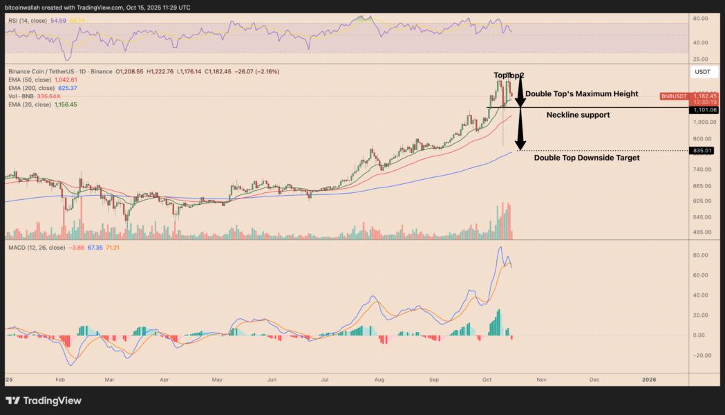 • BNB’s double top pattern suggests a possible 30% correction toward $835 in October.